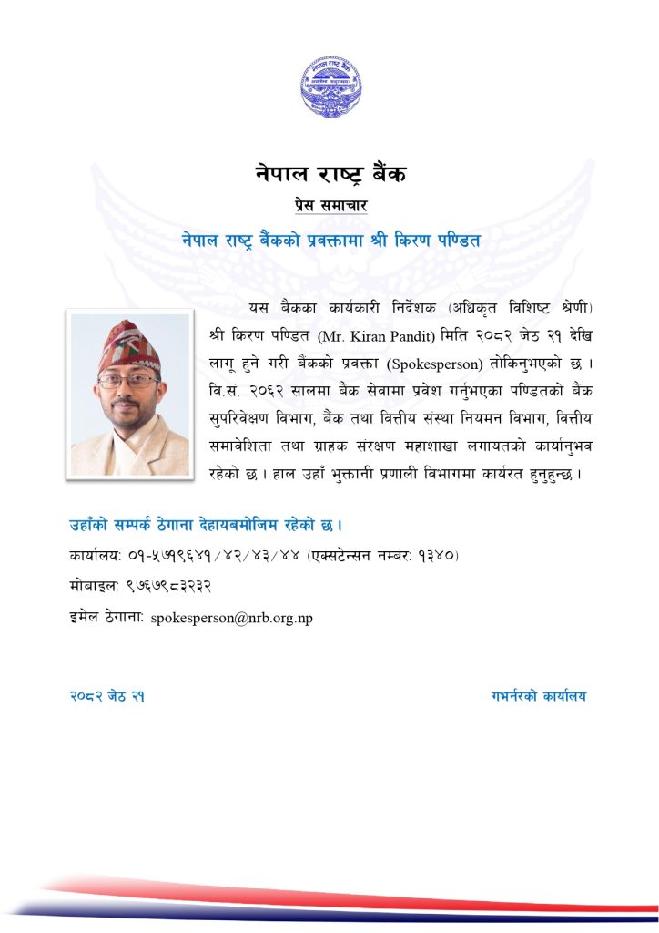 काठमाडौं । नेपाल राष्ट्र बैंकको प्रवक्तामा कार्यकारी निर्देशक किरण पण्डितले जिम्मेवारी पाएका छन् । भुक्तानी प्रणाली विभागको कार्यकारी निर्देशक रहेका पण्डितलाई आज (२१ जेठ) देखि लागु हुनेगरी प्रवक्ताको जिम्मेवारी तोकिएको हो ।