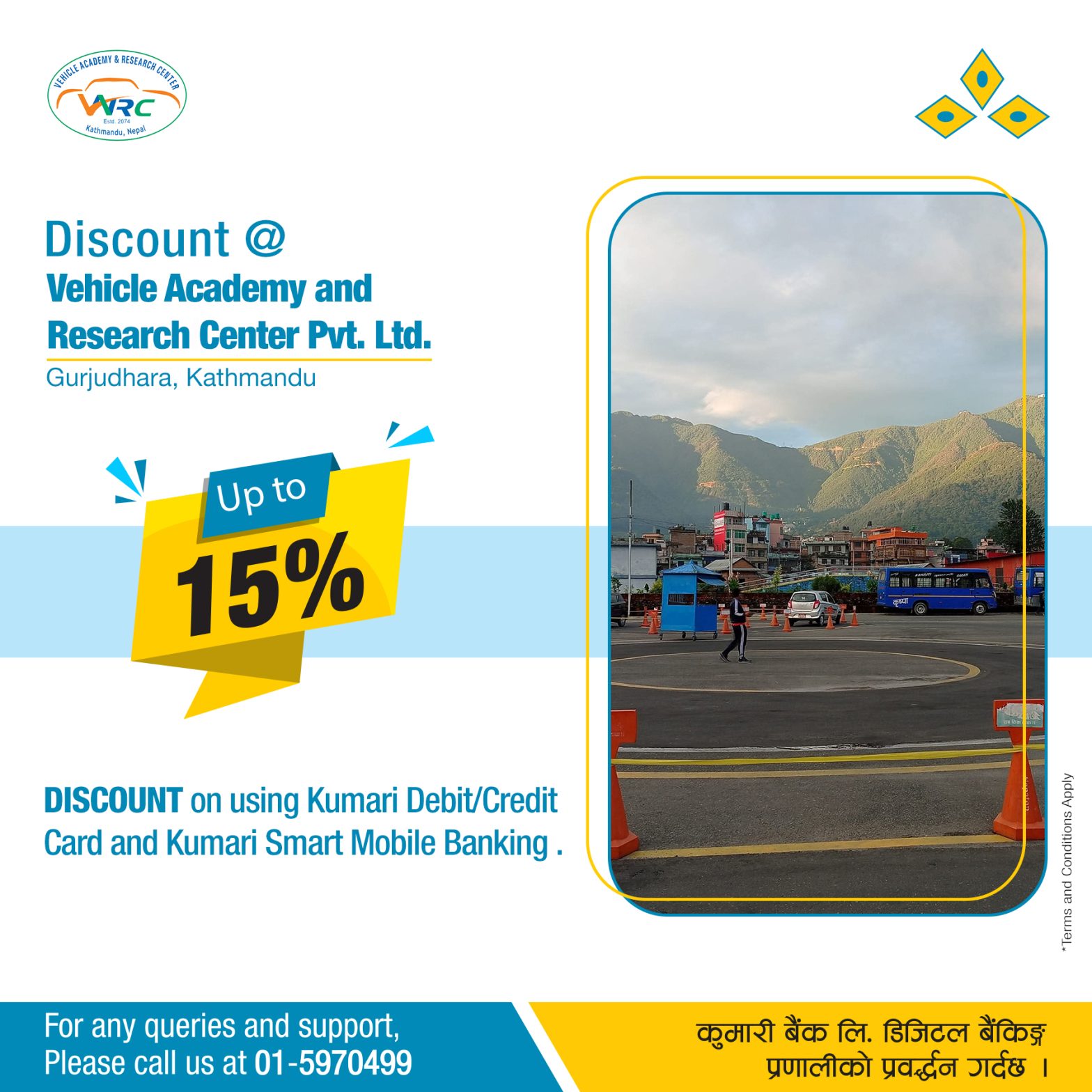 कुमारी बैंक लिमिटेडका ग्राहकवर्गलाई अब एकेडेमीबाट प्रदान गरिने सेवाहरुमा विशेष छुट प्रदान गर्ने गरी सम्झौता भएको हो । सम्झौता अनुसार सवारी चालक अनुमतीपत्रको प्रयोगात्मक परीक्षा (ट्रायल) का लागि रिसर्च सेन्टर प्रा.लिले सञ्चालन गर्दै आएको गुर्जुधारा ट्रायल सेन्टरमा उपलब्ध सम्पूर्ण ड्राइभिङ्ग कोर्सहरुमा कुमारी बैंकका ग्राहकले १५ प्रतिशत छुट पाउँछन् ।