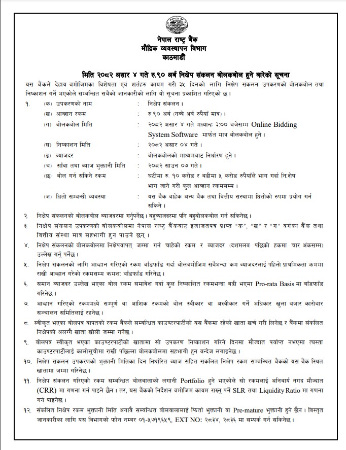 आज बोलकबोल हुने सो रकमको सावाँ तथा ब्याज भुक्तानी आगामी साउन ७ गते दिने राष्ट्र बैंकले जनाएको छ । यसको ब्याजदर समेत बोलकबोलको माध्यमबाट हुनेछ । राष्ट्र बैंकका अनुसार निक्षेप संकलनको बोलकबोल ब्याजदरमा गर्नुपर्नेछ । बैंक तथा वित्तीय संथाले बहु ब्याजदरमा पनि बहुबोलकबोल गर्न सक्नेछन्। निक्षेप संकलन उपकरणको बोलकबोलमा नेपाल राष्ट्र बैंकबाट इजाजतपत्र प्राप्त ‘क’, ‘ख’ र ‘ग’ वर्गका बैंक तथा वित्तीय संस्थामात्र सहभागी हुन पाउने छन् ।