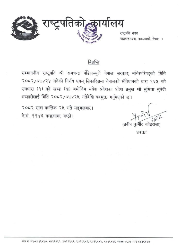 ‘सम्माननीय राष्ट्रपति रामचन्द्र पौडेलज्यूले नेपाल सरकार, मन्त्रिपरिषद्को मिति २०८२/०७/२४ गतेको निर्णय एवम् सिफारिसमा नेपालको संविधानको धारा १६५ को उपधारा (१) को खण्ड (ख) बमोजिम मधेश प्रदेशका प्रदेश प्रमुख सुमित्रा सुवेदी भण्डारीलाई मिति २०८२/०७/२५ गतेदेखि पदमुक्त गर्नुभएको छ,’ राष्ट्रपतिको कार्यालयका प्रवक्ता प्रदीप कुमार कोइरालाले जारी गरेको विज्ञप्तिमा उल्लेख छ ।