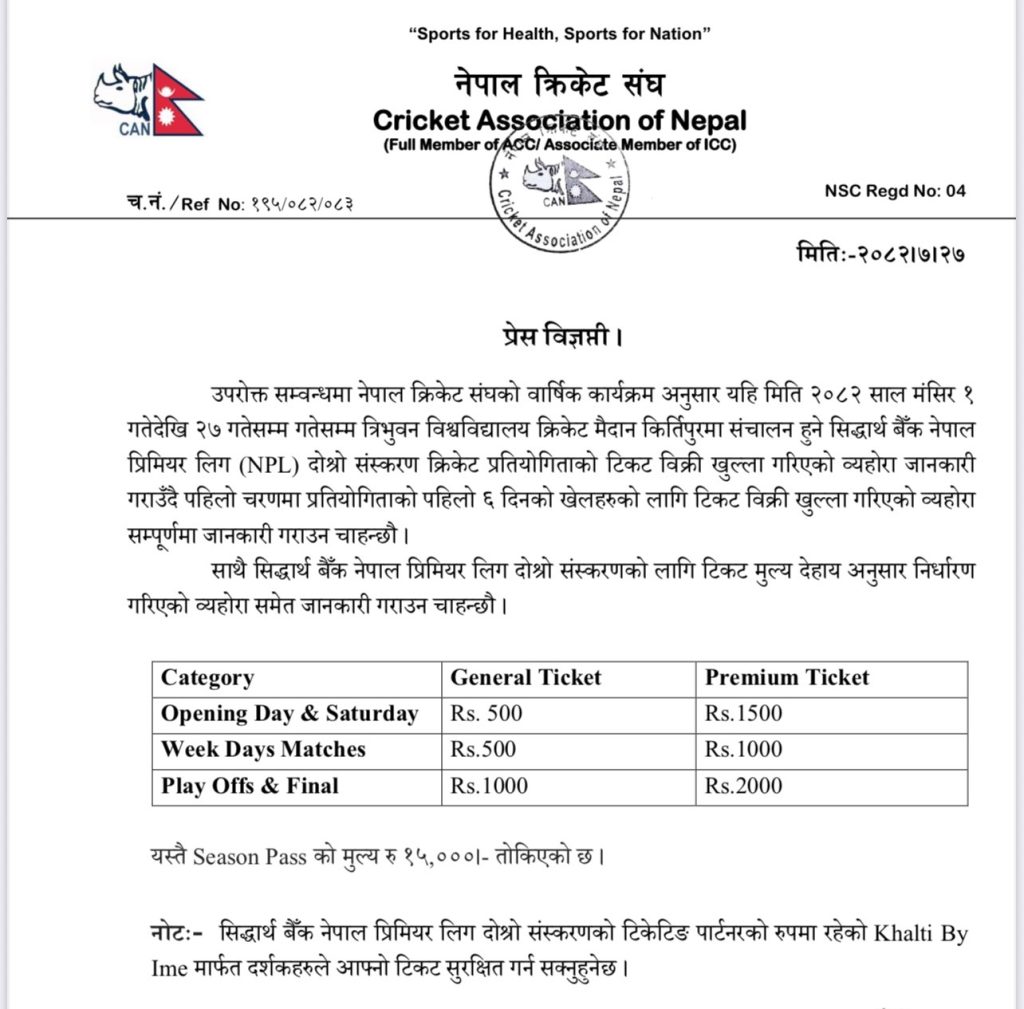 आगामी मंसिर १ गतेदेखि २७ गतेसम्म त्रिभुवन विश्वविद्यालय क्रिकेट मैदान, कीर्तिपुरमा हुने प्रतियोगिताको पहिलो चरणका पहिलो ६ दिनका खेलका लागि टिकट बिक्री खुला गरिएको क्यानले जानकारी दिएको छ।