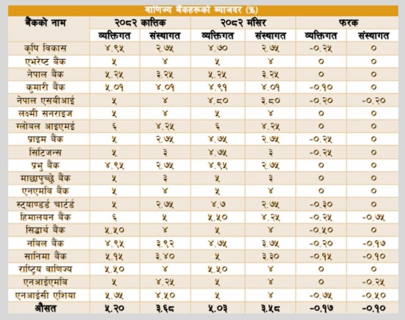 काठमाडौं । वाणिज्य बैंकहरूले मंसिर महिनाका लागि पनि ब्याजदर थप घटाएका छन् । मंसिर १ गतेदेखि (सोमबार) लागू हुने गरी अधिकांश बैंकले कात्तिक महिनाको तुलनामा मुद्दती निक्षेपमा ब्याजदर घटाएका हुन् । मंसिर महिनाका लागि १० बैंकले ब्याजदर घटाउँदा १० बैंकले नै ब्याजदर स्थिर राखेका छन्। औसतमा वाणिज्य बैंकहरूको ब्याजदर ०.१६ प्रतिशत विन्दुले घटेको छ ।