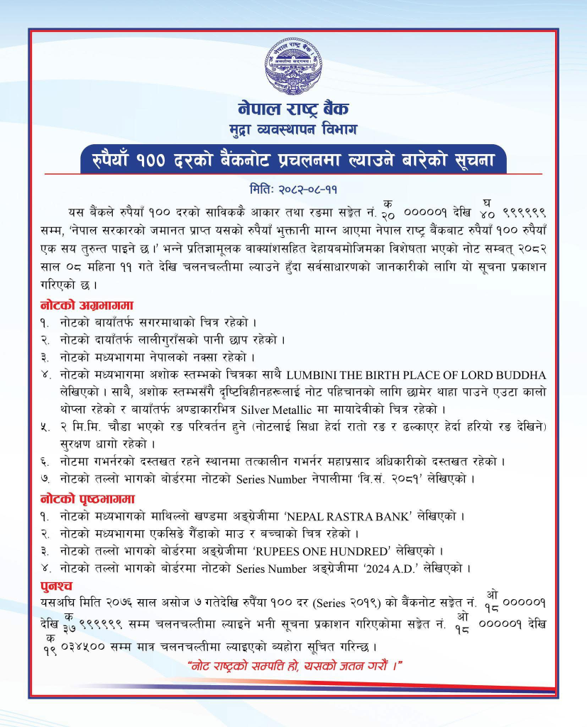 केन्द्रीय बैंकका अनुसार सङ्केत नं. क२० ०००००१ देखि घ४० ९९९९९९ सम्म ‘नेपाल सरकारको जमानत प्राप्त यसको रूपैयाँ भुक्तानी माग्न आएमा नेपाल राष्ट्र बैंकबाट रुपैयाँ १०० रुपैयाँ तुरुन्त पाइने छ,’ भन्ने प्रतिज्ञामूलक वाक्यांशसहित उक्त नोट आजदेखि चलनचल्तीमा ल्याइएको हो ।