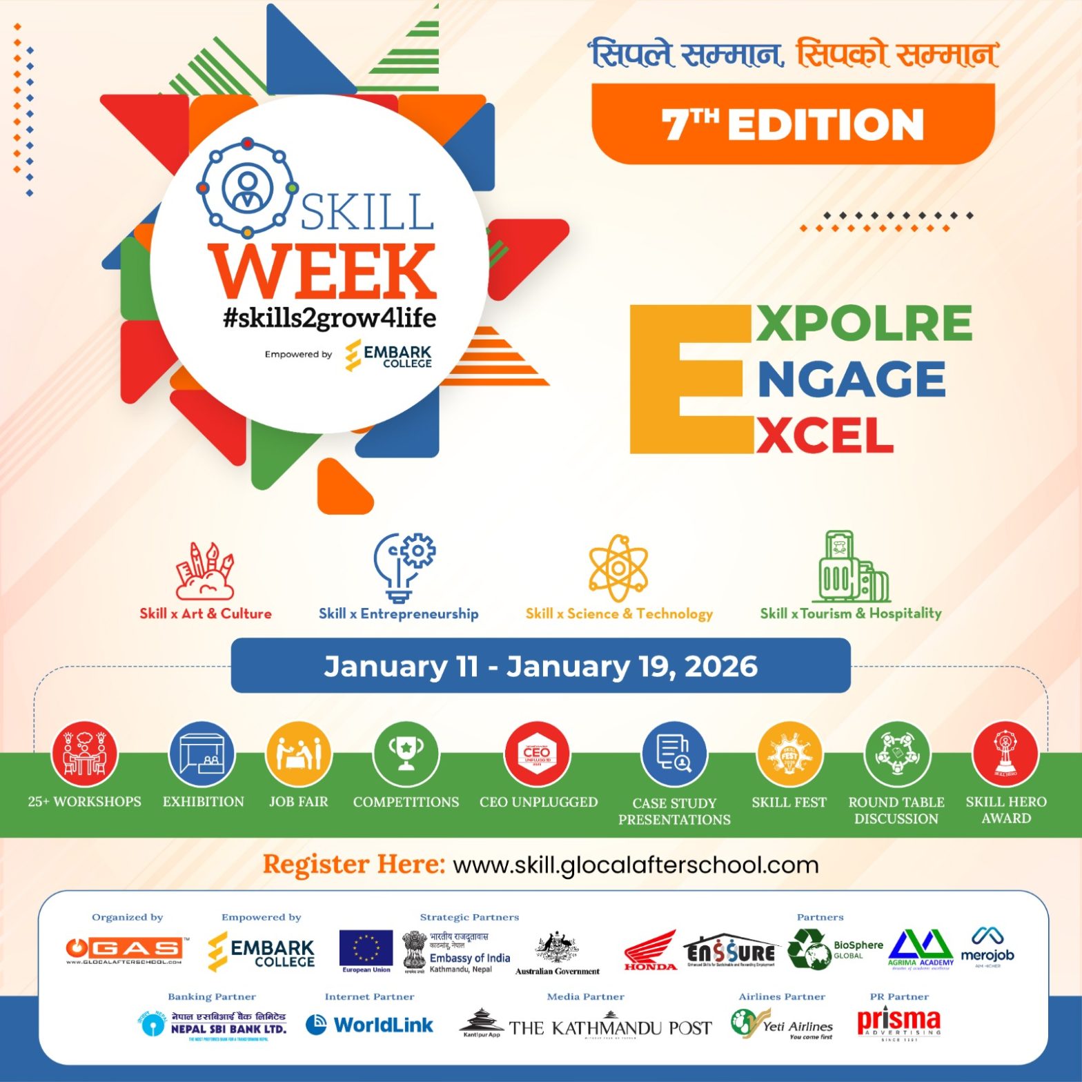 कार्यक्रमअन्तर्गत नेतृत्व, प्रविधि, सञ्चार, सिर्जनशीलता र उद्यमशीलतासम्बन्धी कार्यशाला, प्रतियोगिता तथा अन्तर्क्रियात्मक सत्रहरू सञ्चालन गरिनेछन्। जनवरी १६ मा ‘फेस्ट डे’ आयोजना गरिनेछ, जहाँ सीप प्रदर्शनी, सांगीतिक प्रस्तुति र युवा प्रतिभा प्रदर्शन हुनेछन्। जनवरी १९ मा समापन समारोह सहित ‘स्किल हिरो अवार्ड्स’ प्रदान गरिनेछ।