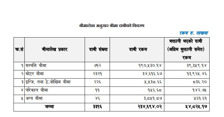 यसैगरी, इञ्जिनीयरिङ तथा ठेक्का जोखिम बीमातर्फ कूल २२६ वटा बीमा दाबीको करिब ५५ करोड ३९ लाख दाबी रकममध्ये ८ करोड ३६ लाख, परिवहन बीमातर्फ कूल १२ वटा बीमा दाबीको १ करोड ६९ लाख दाबी रकममध्ये १ करोड ५५ लाख र अन्य बीमातर्फ कूल ४५ वटा बीमा दाबीको ३८ करोड ४० लाख दाबी रकममध्ये ५ करोड अग्रिम भुक्तानी समेत गरी दाबी रकम भुक्तानी भएको छ ।