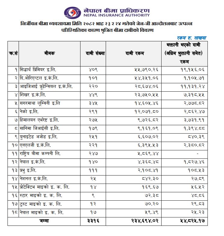 काठमाडाैं । गत भदौ २३ र २४ गते जेनजी आन्दोलनका क्रममा भएका भौतिक तथा अन्य क्षतिको निर्जीवन बीमा कम्पनीहरूमा ३ हजार ३१६ वटा बीमा दाबी परेको छ । २३ अर्ब ४७ करोड दाबी रकममध्ये हालसम्ममा अग्रिम भुक्तानी समेत गरी ५ अर्ब ४८ करोड २५ लाख दाबी रकम बीमितहरूलाई भुक्तानी गरिएको छ ।
