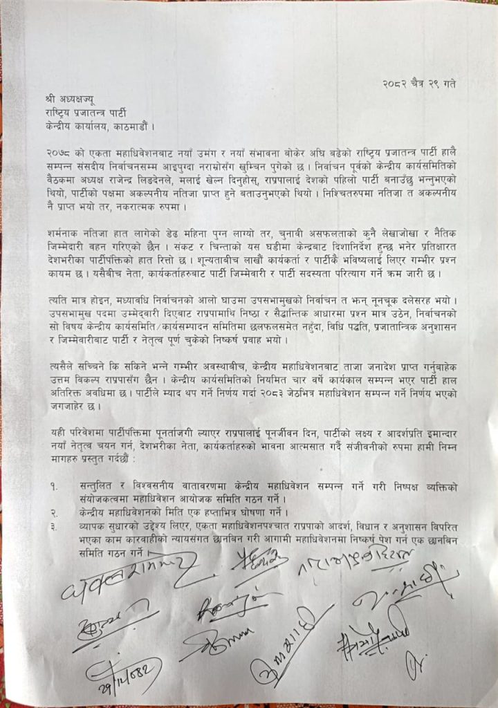 काठमाडौं । राष्ट्रिय प्रजातन्त्र पार्टी (राप्रपा) भित्र केन्द्रीय महाधिवेशनको माग तीव्र बनेको छ । पार्टीका नेता तथा कार्यकर्ताहरूले हालै सम्पन्न संसदीय निर्वाचनमा भएको कमजोर प्रदर्शनपछि नेतृत्वको भूमिकामाथि गम्भीर प्रश्न उठाउँदै तत्काल महाधिवेशन गर्न माग गरेका छन् ।