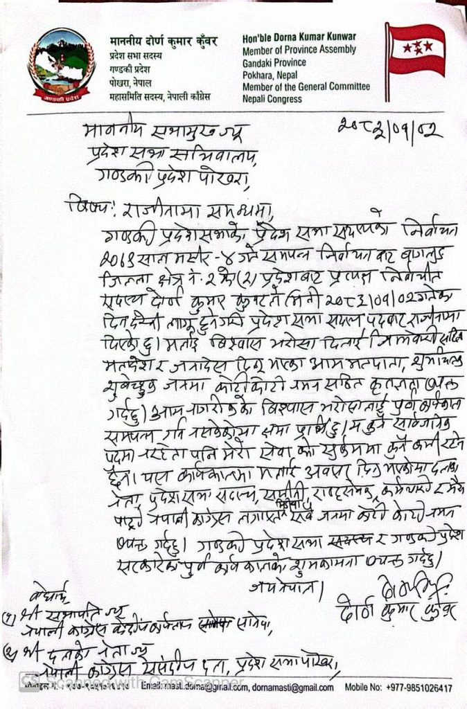 बागलुङ जिल्ला क्षेत्र नम्बर २ (२) बाट प्रत्यक्ष निर्वाचित कुँवरले गण्डकी प्रदेशसभाका सभामुखलाई सम्बोधन गर्दै बुधबार राजीनामा बुझाए । उनले वैशाख २ गतेदेखि लागू हुने गरी आफ्नो राजीनामा दिएका हुन् ।