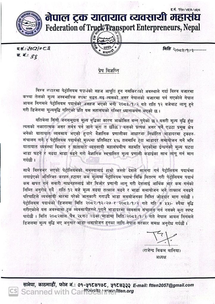 नेपाल ट्रक यातायात व्यवसायी महासंघले एक प्रेस विज्ञप्ति जारी गर्दै डिजेलको मूल्यवृद्धिप्रति गम्भीर ध्यानाकर्षण भएको जनाएको छ। महासंघका अनुसार पछिल्लो समय पेट्रोलियम पदार्थको मूल्य वृद्धि हुँदा त्यसको प्रत्यक्ष असर यातायात क्षेत्रमा पर्ने भएकाले भाडादर समायोजन अपरिहार्य भएको हो।