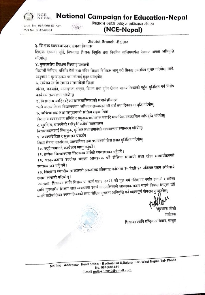 सबैका लागी समान र समावेशी शिक्षा,विपन्न तथा दुर्गम क्षेत्रका बालबालिकाको पहुँच सुनिश्चित गर्न विशेष कार्यक्रम सञ्चालन, विद्यालय बाहिर रहेका बालबालिकाको समावेशीकरण, सबै बालबालिका विद्यालयमा अभियान सञ्चालन गरी भर्ना तथा टिकाउ दर वृद्धि, पढ्दै कमाउँदै कार्यक्रम,प्रत्येक विद्यालयमा नर्सको व्यवस्थापन गर्न माग गरिएको हो ।