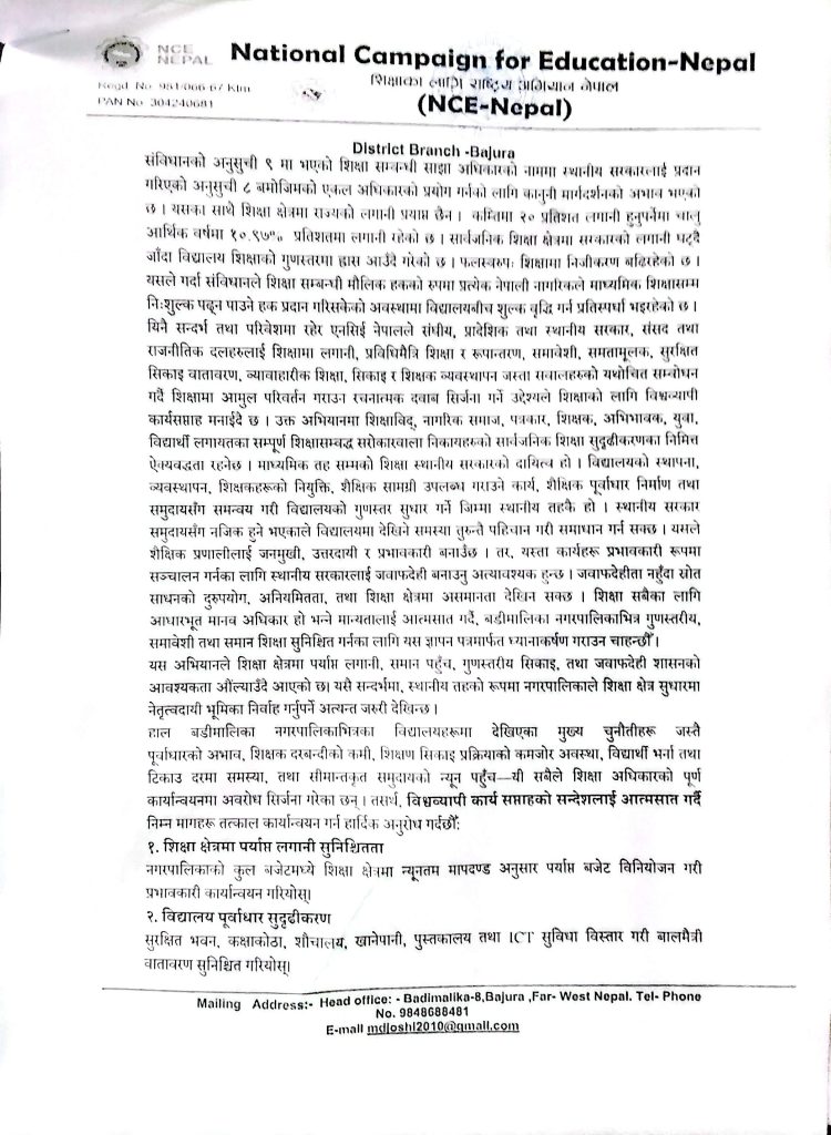 बाजुरा । शिक्षाका लागि राष्ट्रिय अभियान नेपाल (एनसिई) बाजुराले बडी मालिका नगरपालिकालाई शिक्षा क्षेत्रमा गरिनुपर्ने महत्त्वपूर्ण सुधारको मागसहित ध्यानाकर्षण पत्र बुझाएको छ । शनिबार एनसिई बाजुराका अध्यक्ष मदनराज जैशीले विभिन्न १३ वटा मागसहितको ध्यानाकर्षण पत्र नगर प्रमुख अमर बहादुर खड्का समक्ष बुझाएका हुन् ।