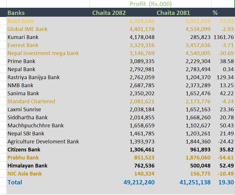 नाफाको आधारमा नबिल बैंक अग्रस्थानमा रहेको छ। नबिलले ६ अर्ब ७६ करोड ४६ लाख ४६ हजार रुपैयाँ नाफा कमाएको छ, जुन गत वर्षको सोही अवधिको तुलनामा ३३.९२ प्रतिशतले बढी हो। दोस्रो स्थानमा ग्लोबल आइएमई बैंक रहेको छ, जसले ४ अर्ब ४० करोड ११ लाख रुपैयाँ नाफा आर्जन गरेको छ। त्यसपछि कुमारी बैंकले ४ अर्ब १७ करोड ८० लाख रुपैयाँ नाफा कमाउँदै तेस्रो स्थानमा रहेको छ।